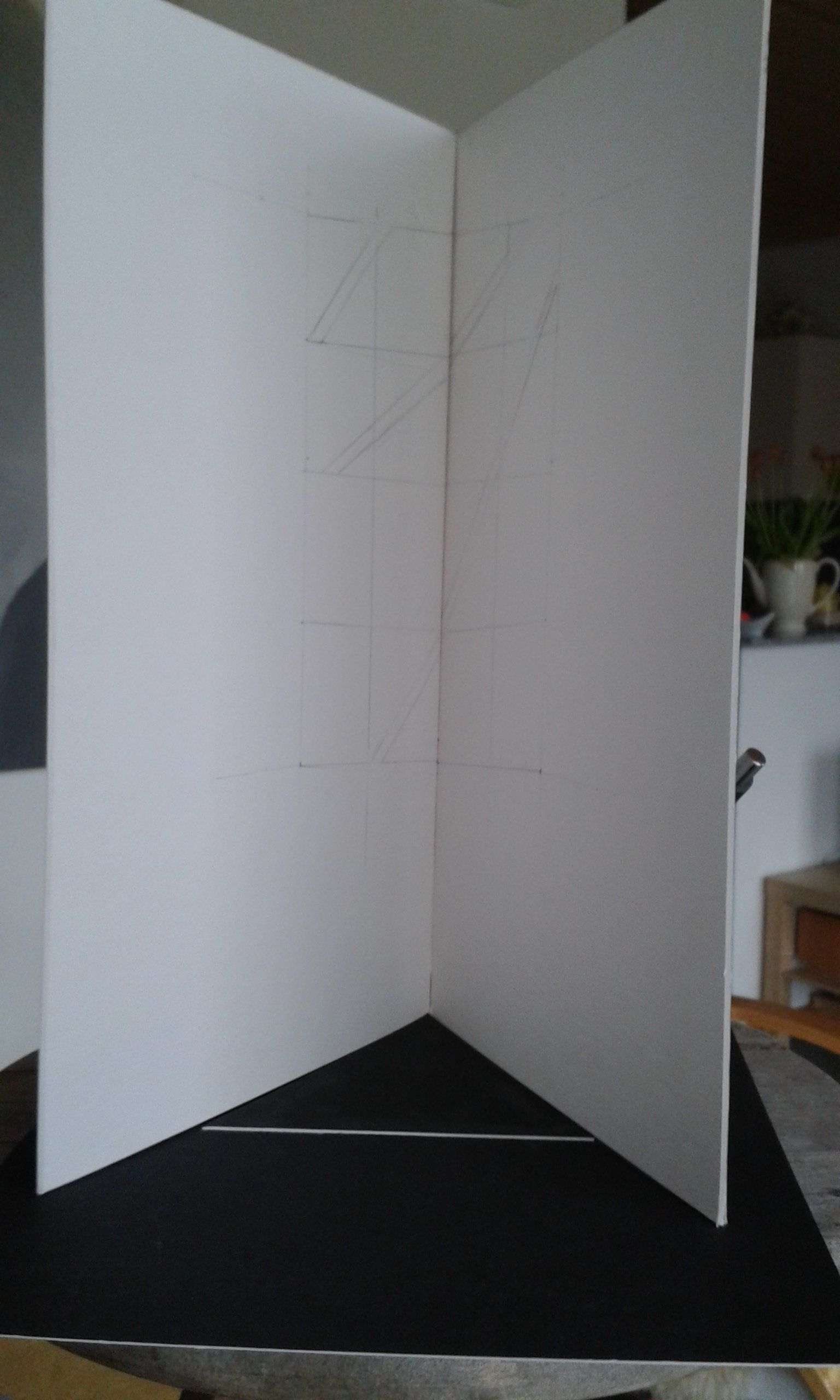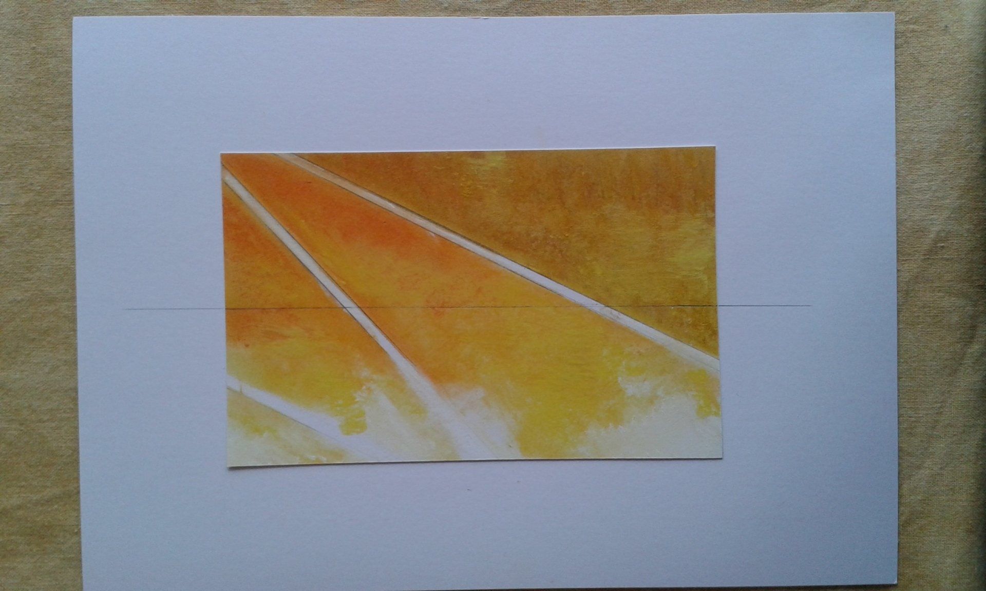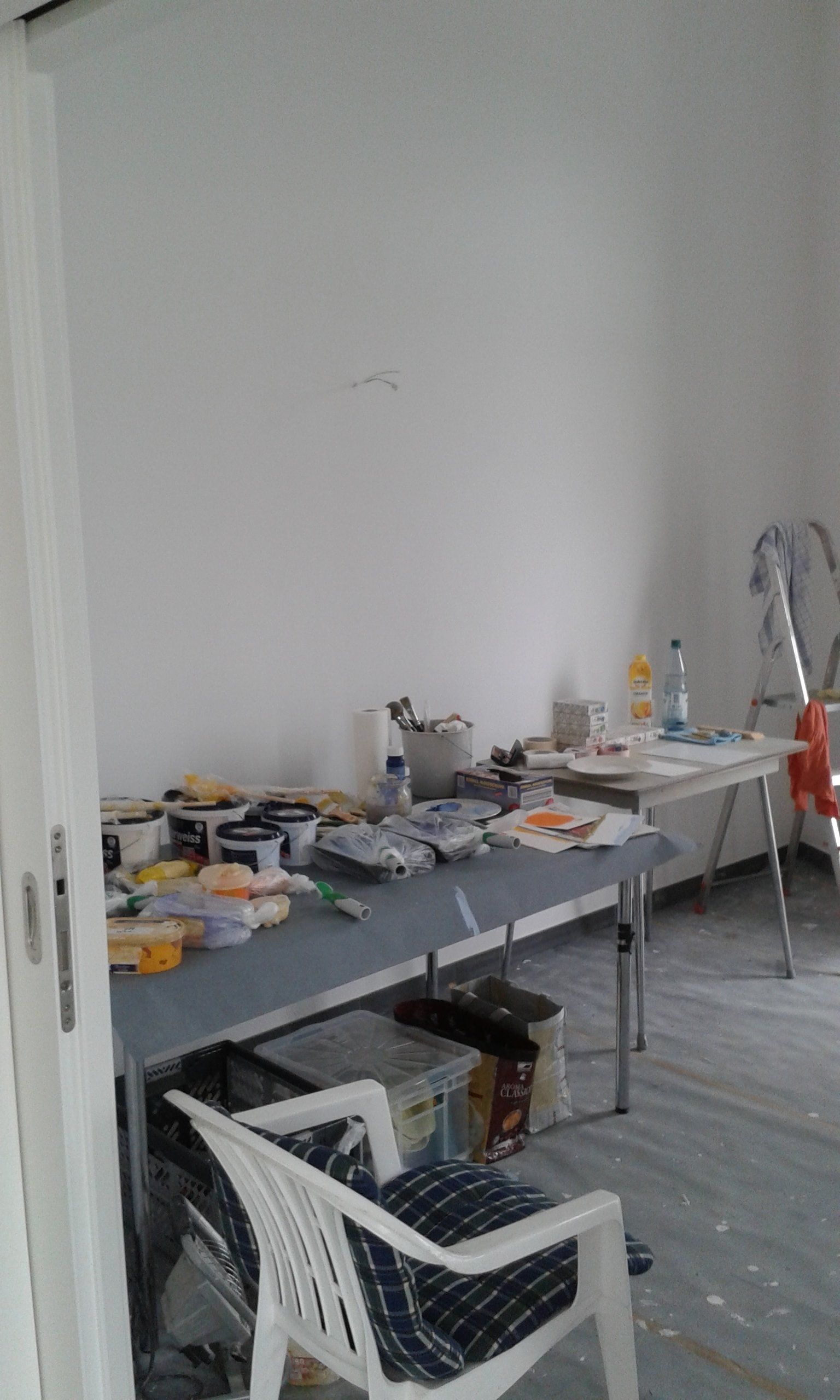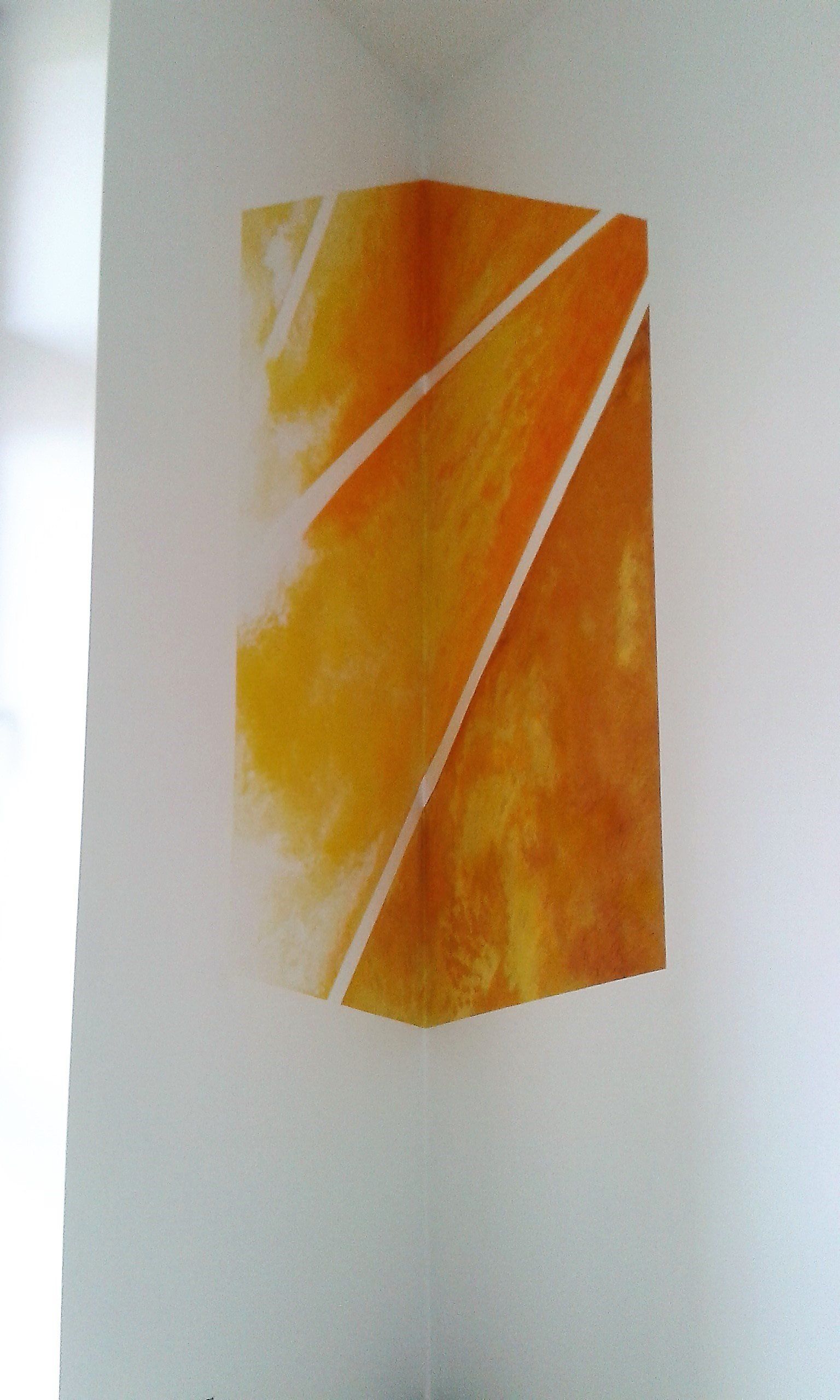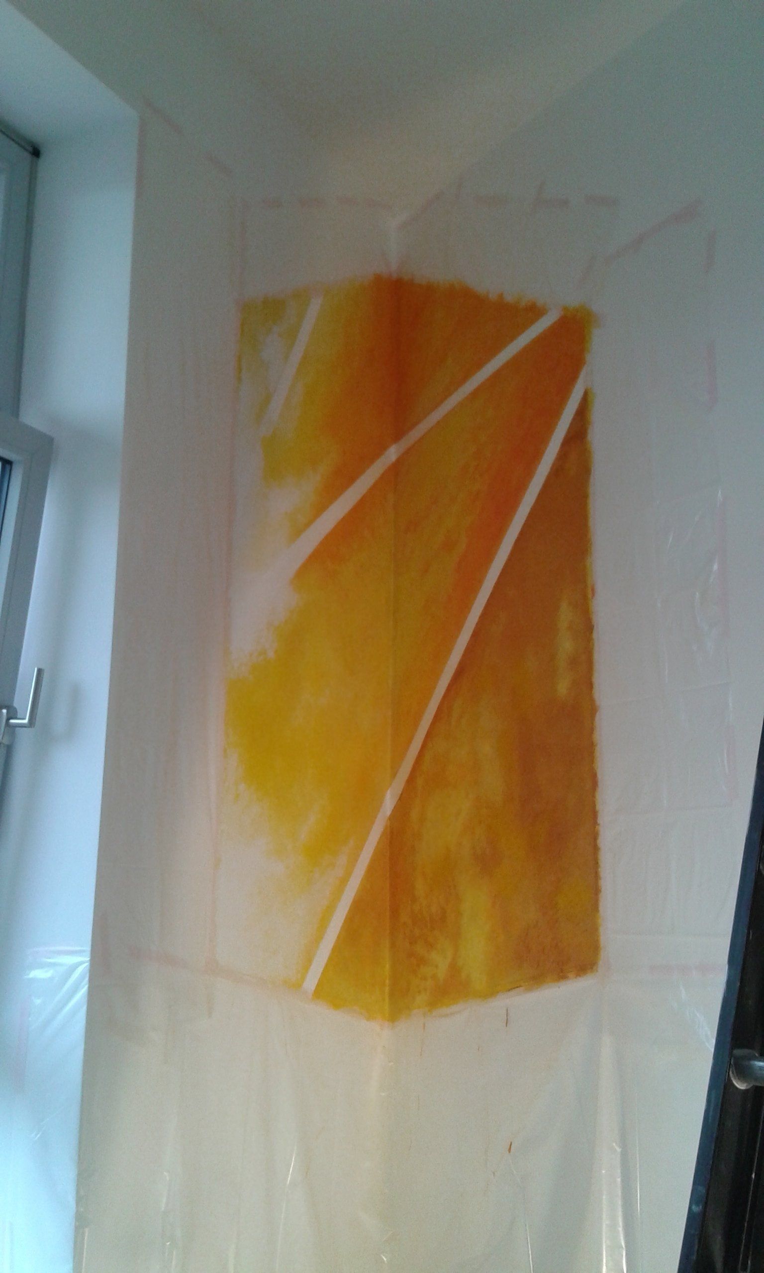 Es entstanden 3 großformatige Wandbilder mit den Titeln „das Licht“ (102cm x 160cm), „der Weg“ (98cm x 195cm) und „die Liebe“ (100cm x 167cm). Das Gemälde „das Licht“ stellte dabei für mich eine besondere Herausforderung dar, da ich es im spitzen Winkel des Raumes durch eine Fluchtpunktperspektive auf den Betrachter ausrichten musste.