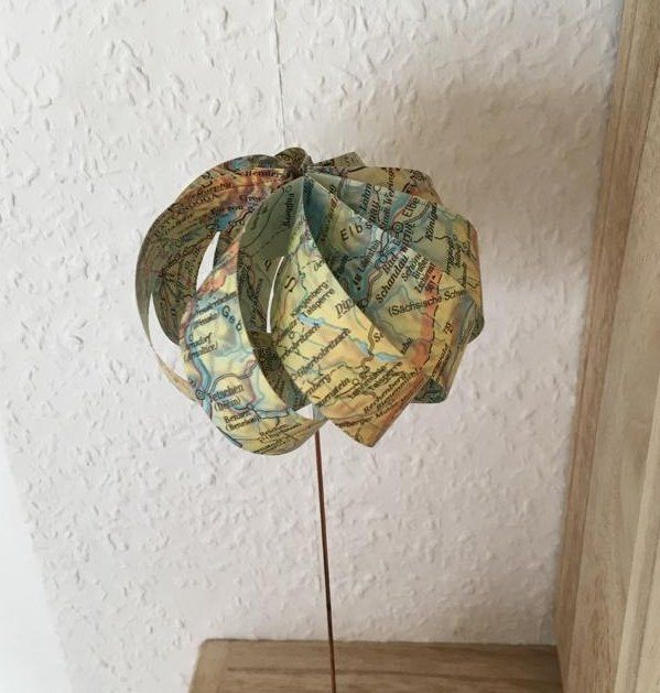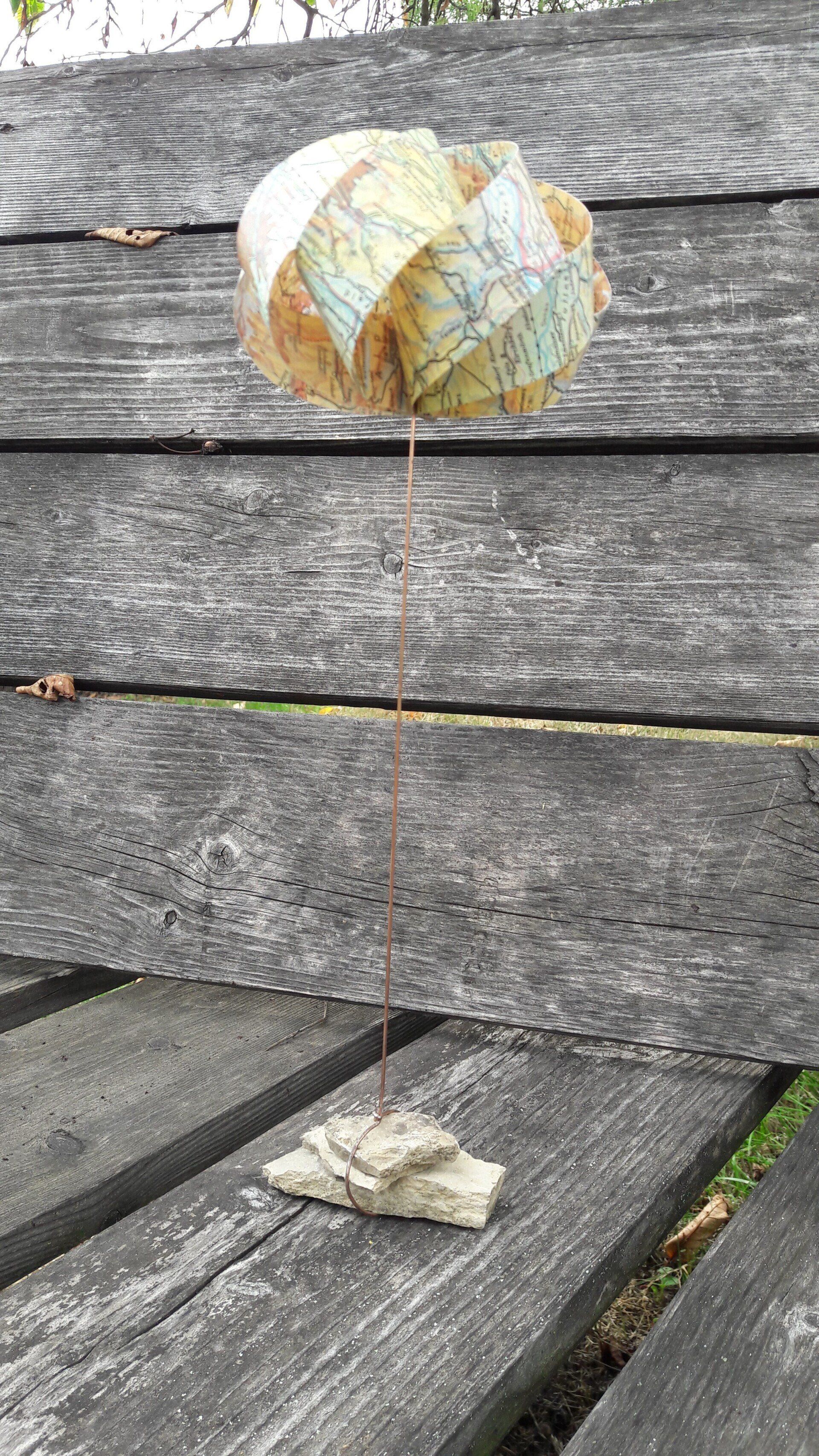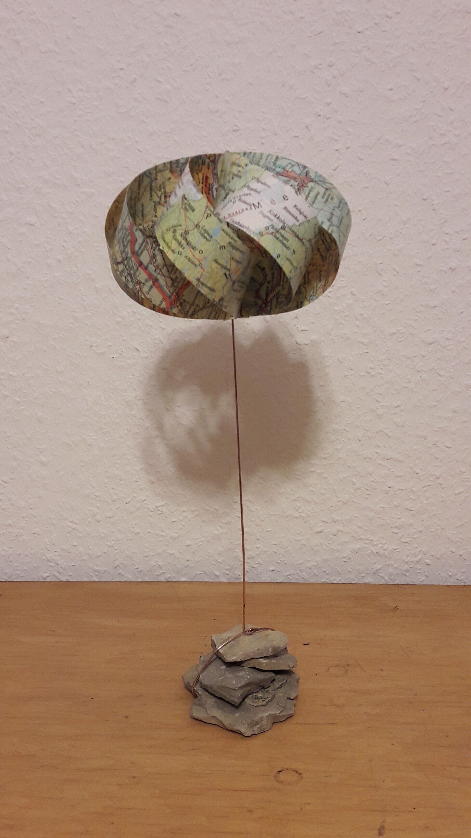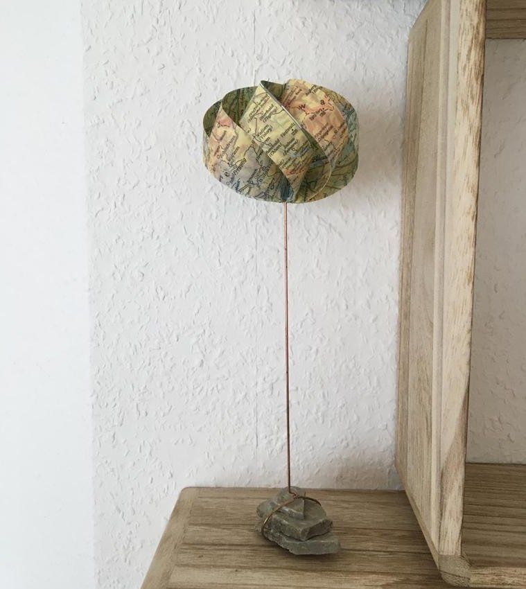 Gesehen und neu interpretiert: Die wolkenhaften Gebilde aus alten Schulatlanten entdeckte ich mit meiner Schwester in einem Buch. Wir haben diese schöne Idee aufgegriffen. Die Papierkörper wurden auf einen etwa 20 cm langen Kupferdraht gesetzt und mit einem kleinen Sockel aus lose geschichteten Kalksteinen aus der Rhön versehen. Entstanden sind auf diese Weise luftige, leichte Objekte zum Hinstellen und Träumen.