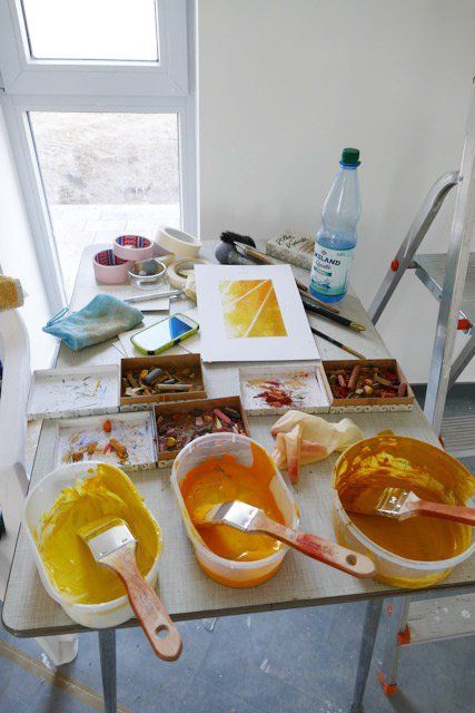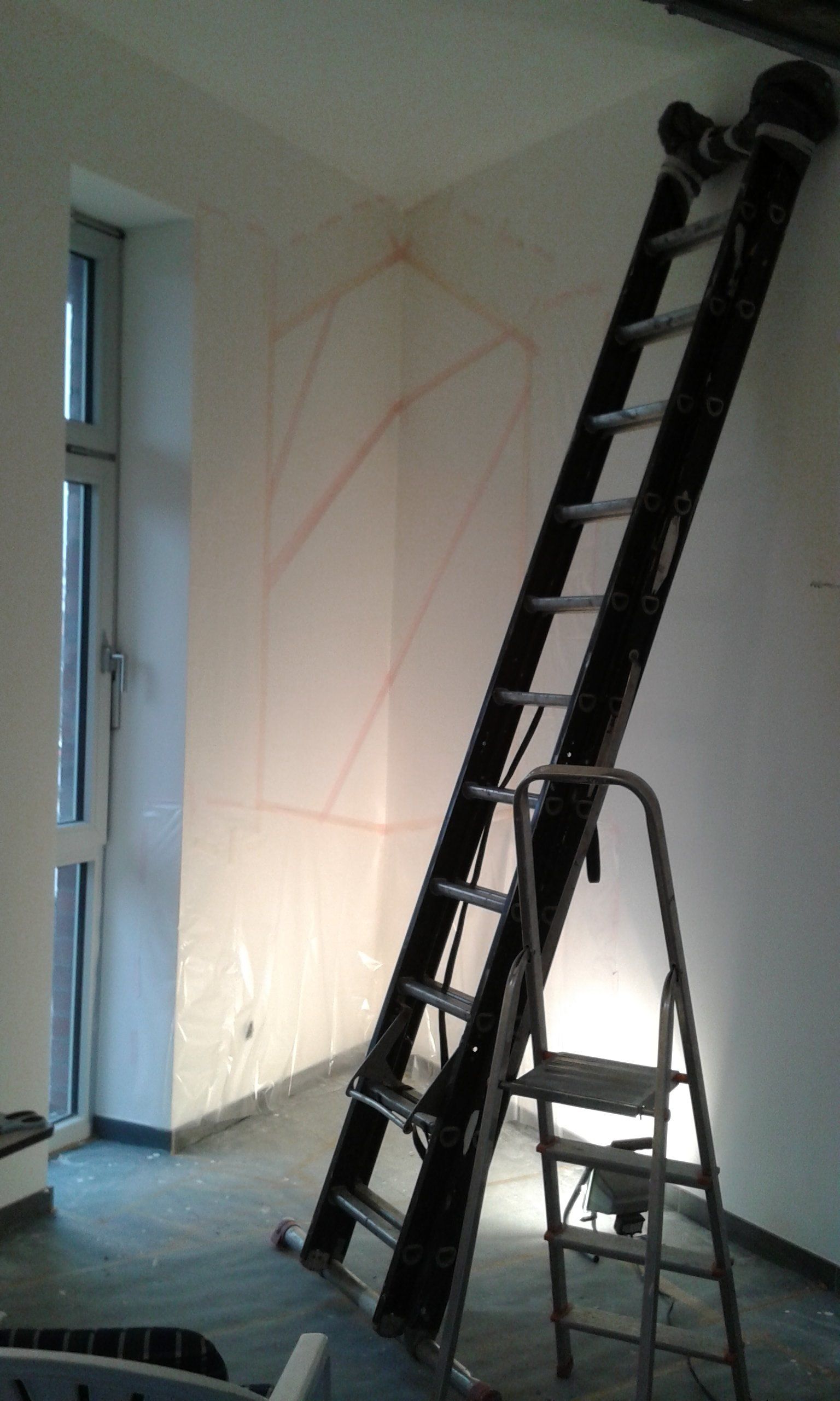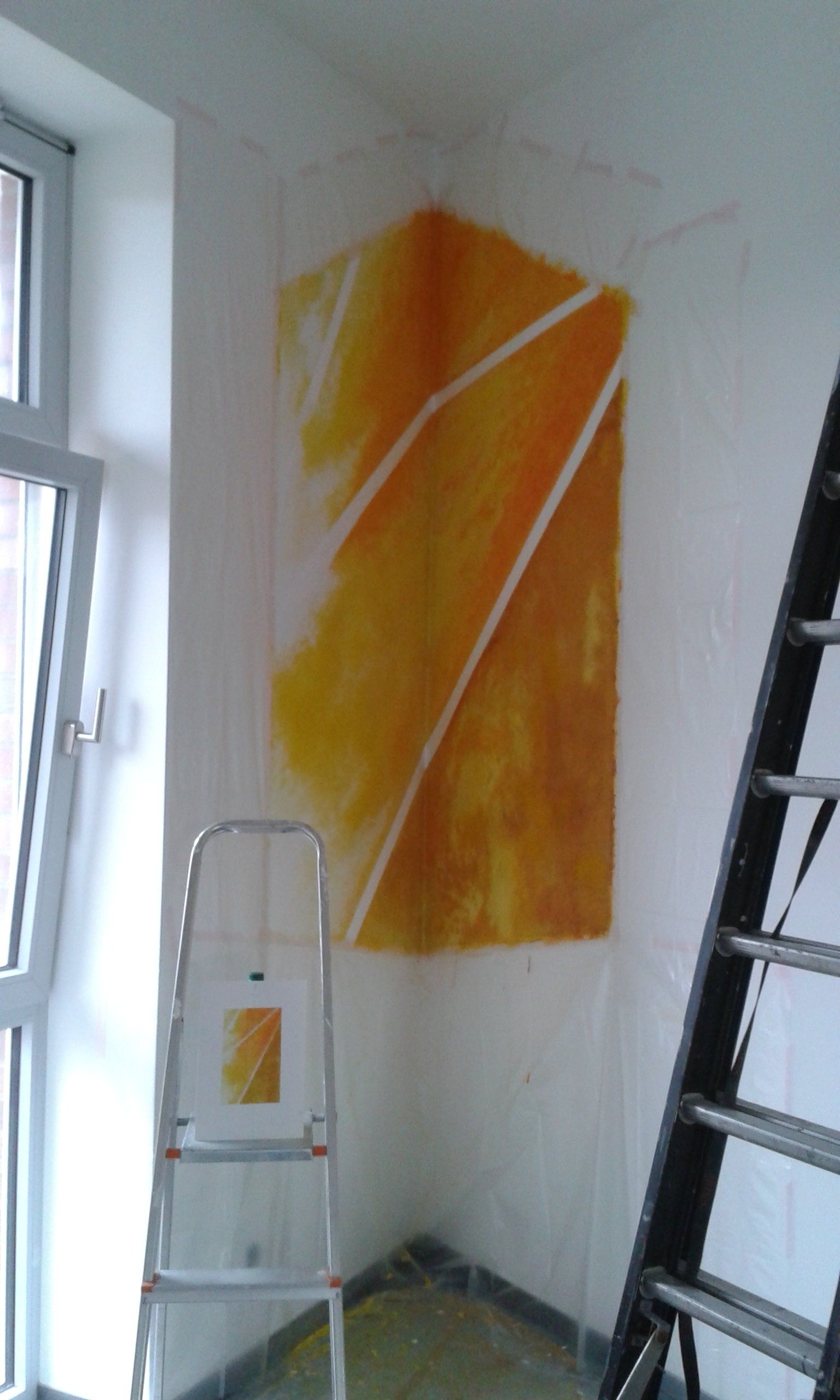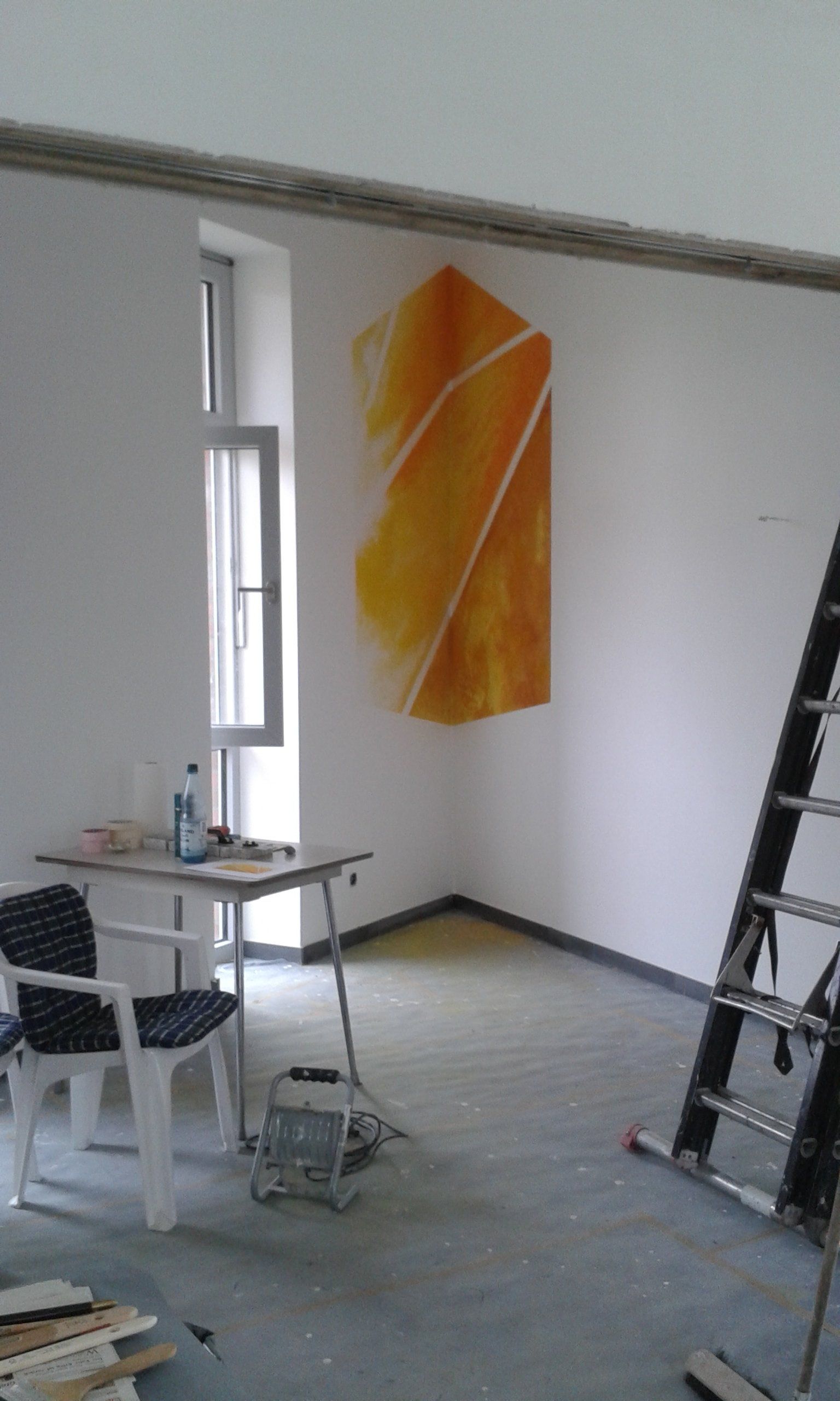 Es entstanden 3 großformatige Wandbilder mit den Titeln „das Licht“ (102cm x 160cm), „der Weg“ (98cm x 195cm) und „die Liebe“ (100cm x 167cm). Das Gemälde „das Licht“ stellte dabei für mich eine besondere Herausforderung dar, da ich es im spitzen Winkel des Raumes durch eine Fluchtpunktperspektive auf den Betrachter ausrichten musste.