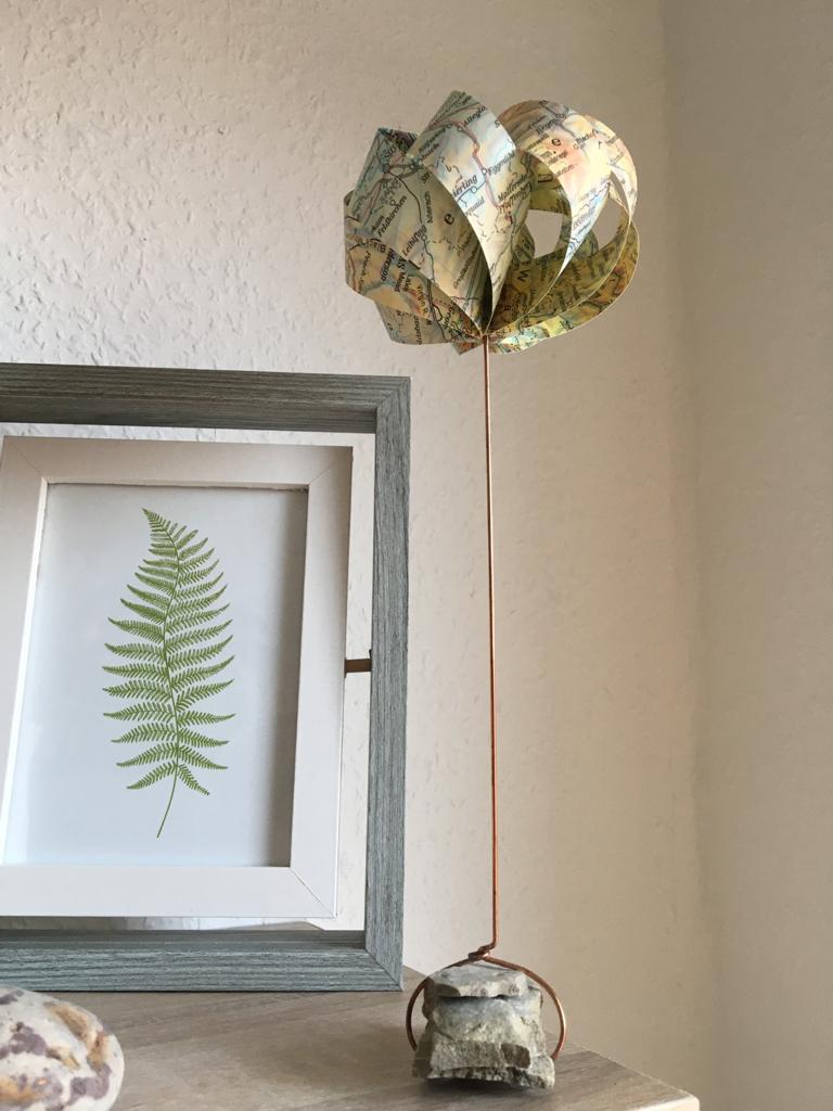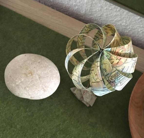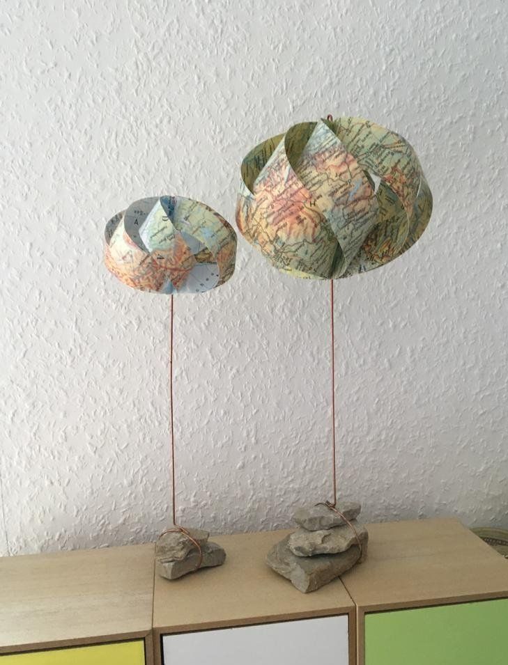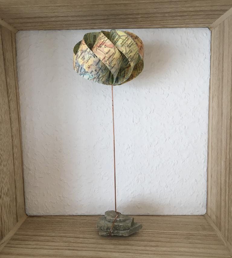 Gesehen und neu interpretiert: Die wolkenhaften Gebilde aus alten Schulatlanten entdeckte ich mit meiner Schwester in einem Buch. Wir haben diese schöne Idee aufgegriffen. Die Papierkörper wurden auf einen etwa 20 cm langen Kupferdraht gesetzt und mit einem kleinen Sockel aus lose geschichteten Kalksteinen aus der Rhön versehen. Entstanden sind auf diese Weise luftige, leichte Objekte zum Hinstellen und Träumen.