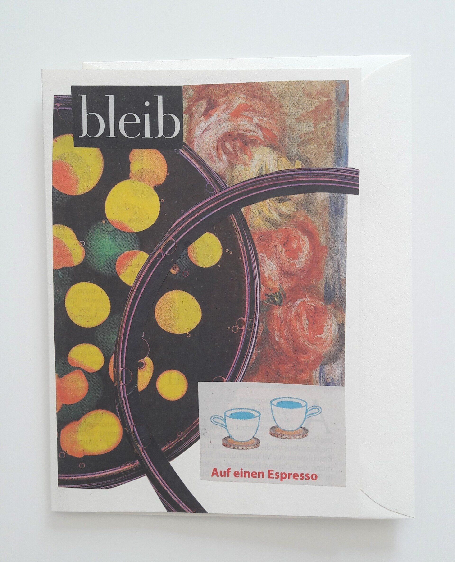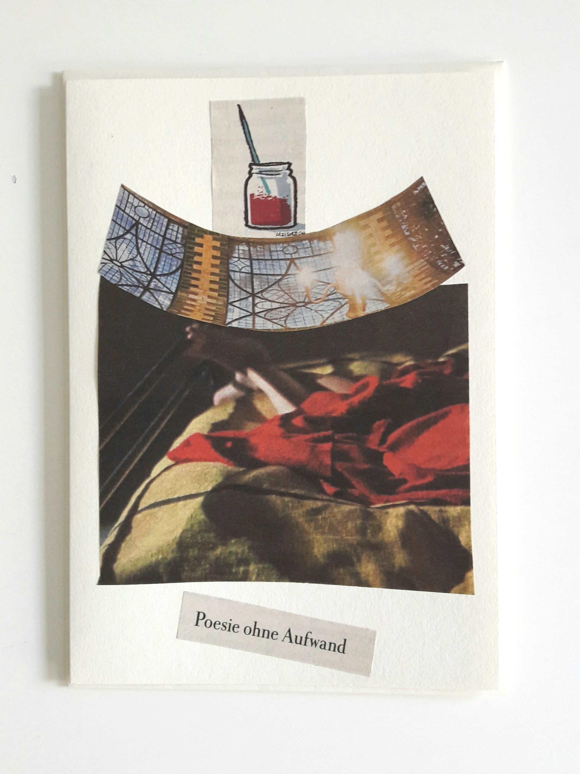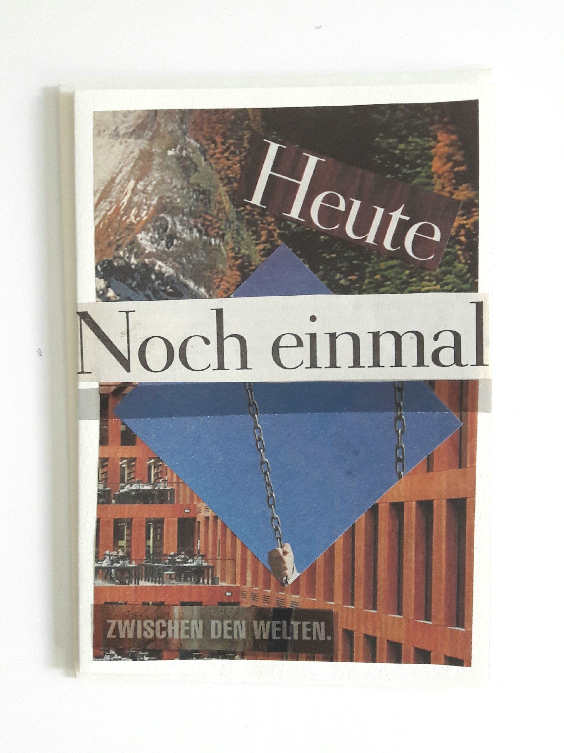Die Faltkarten aus festem naturweißem Karton im Hochformat 12 x 17 cm sind als Collagen aus Zeitungspapier gestaltet.