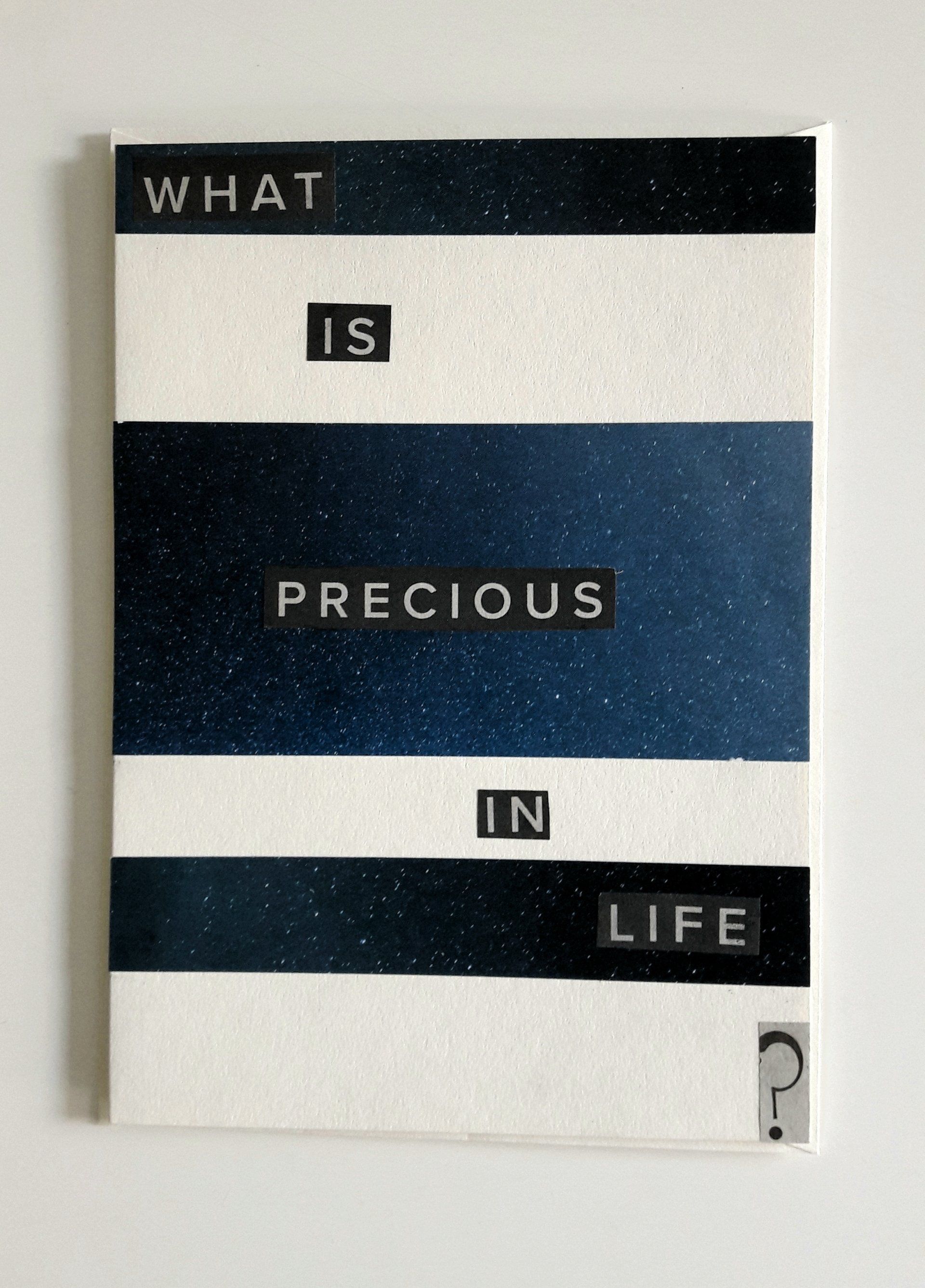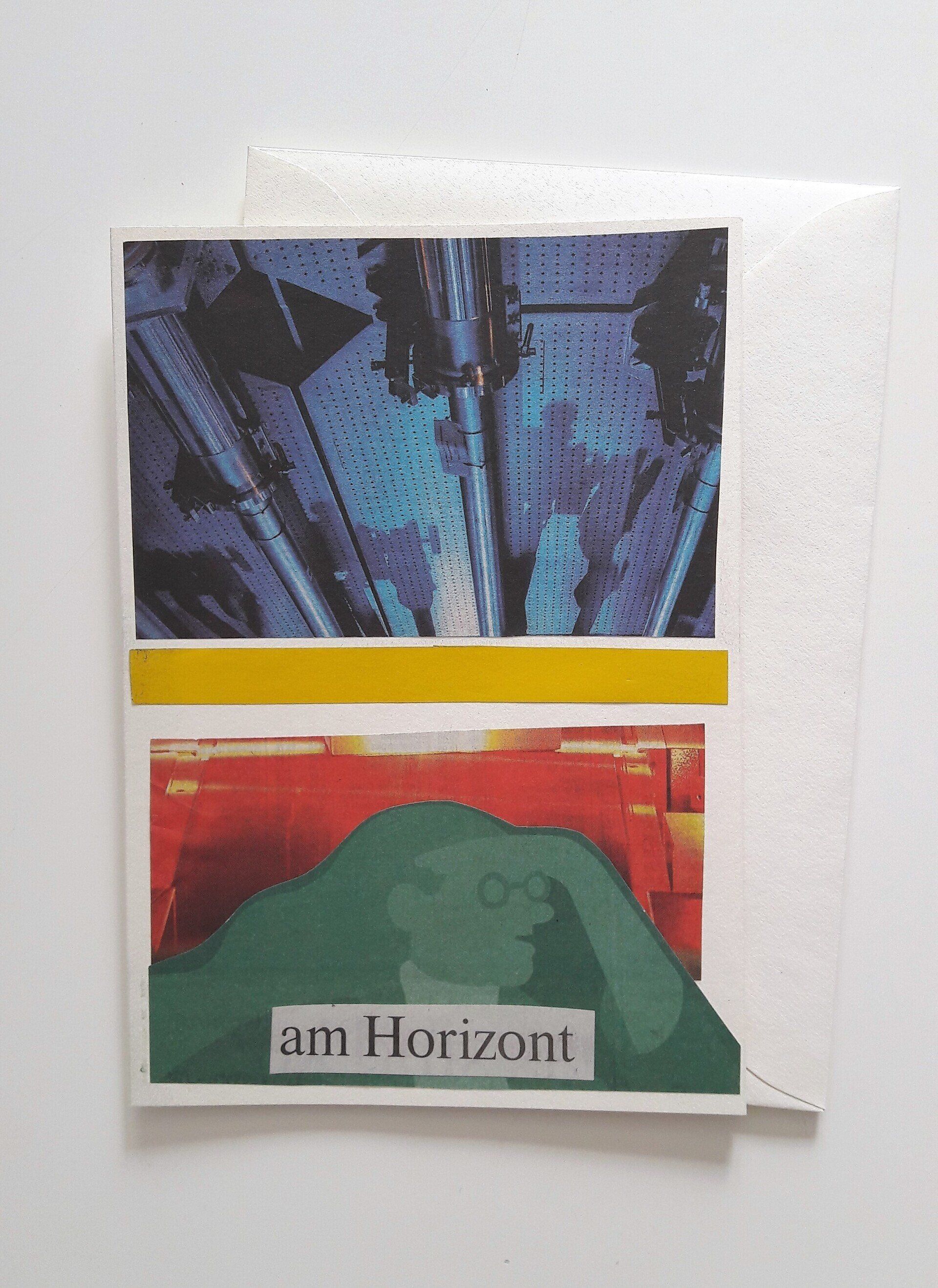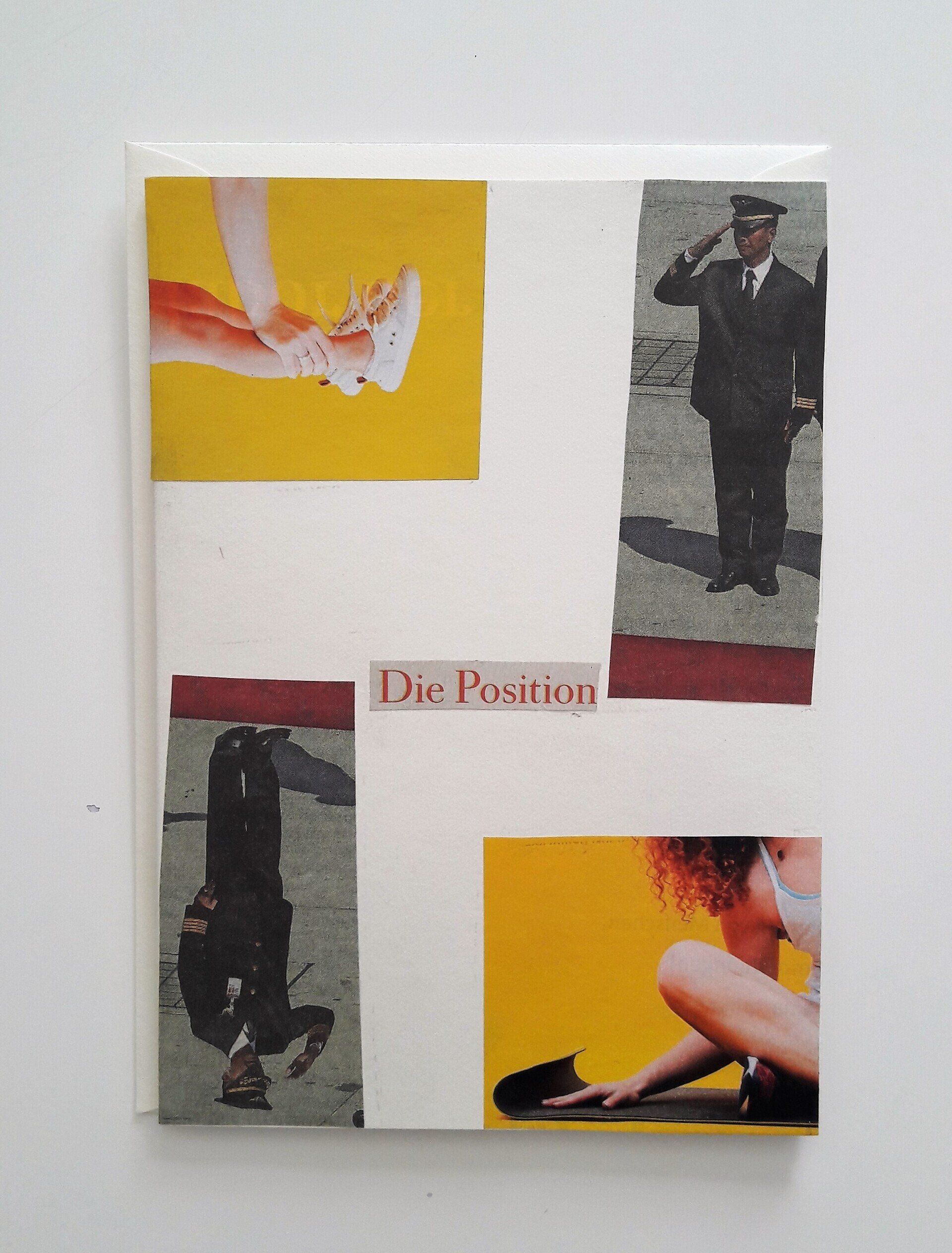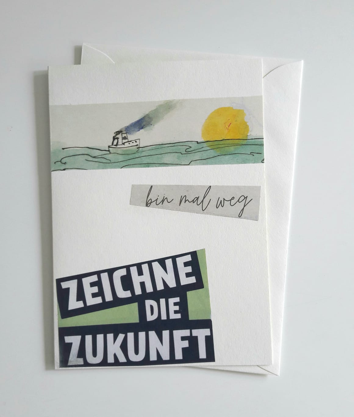 Die Faltkarten aus festem naturweißem Karton im Hochformat 12 x 17 cm sind als Collagen aus Zeitungspapier gestaltet.