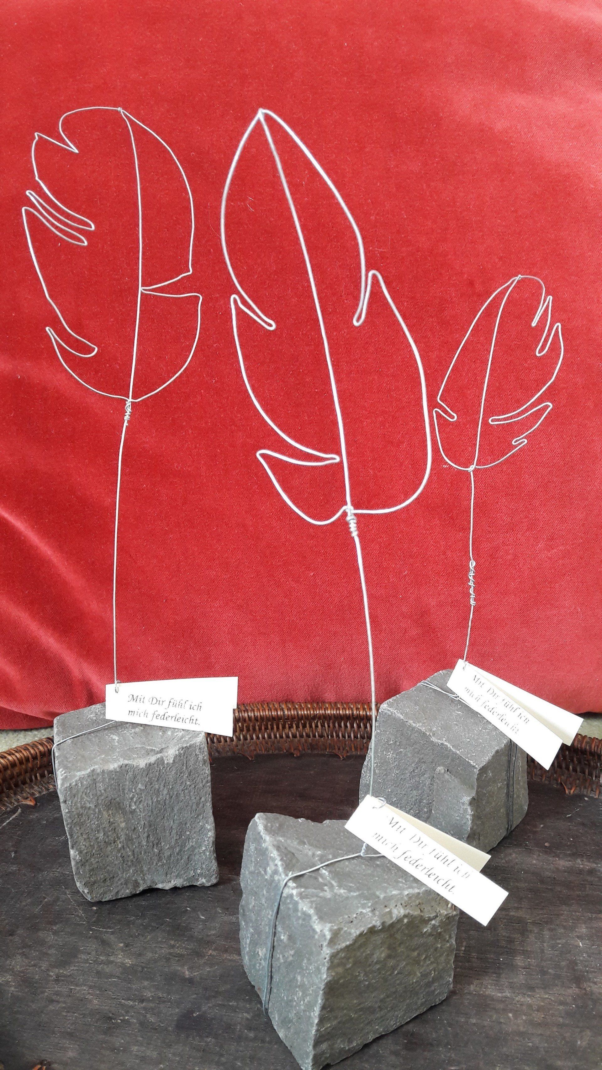 "Mit dir fühl ich mich federleicht." - Das war der Gedanke, der mich zu diesem kleinen Drahtobjekt inspiriert hat. Er ziert auch das kleine Spruchband am Schaft der Feder. Besonders reizvoll finde ich den Kontrast zwischen der weichen Form der Feder aus Bindedraht und einem Pflasterstein (aus Grauwacke) als Sockel.