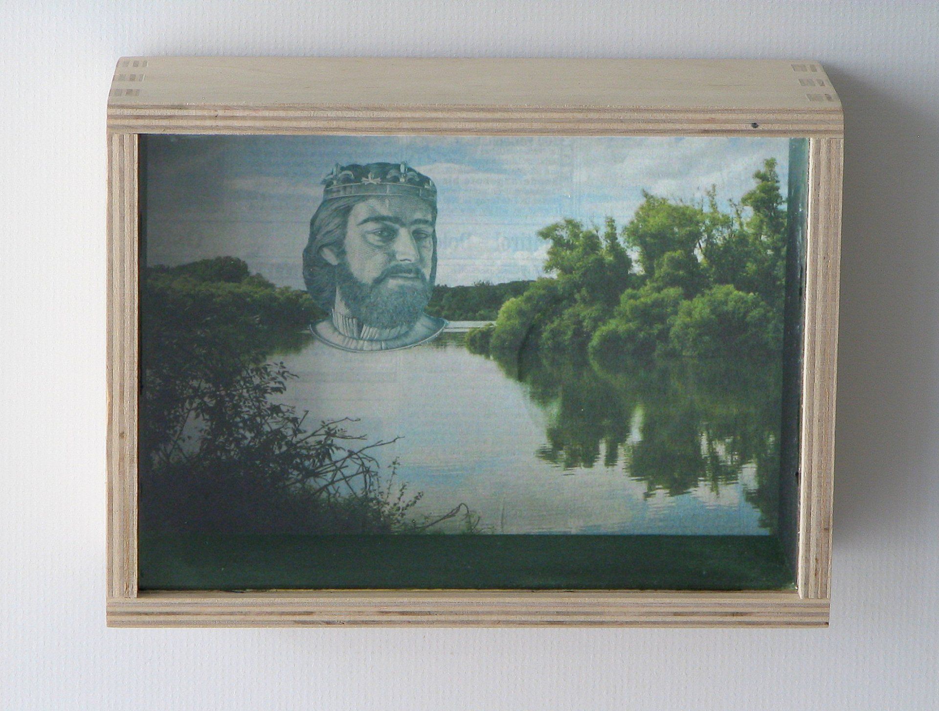 mit Dollarnote, Zeitungspapier, Draht, Goldlack auf Glas