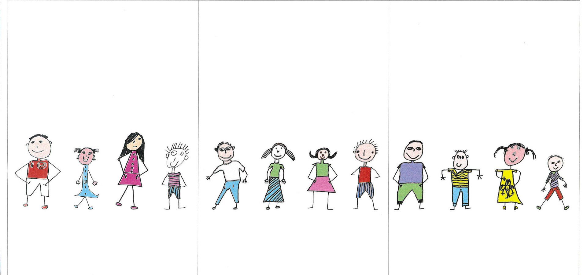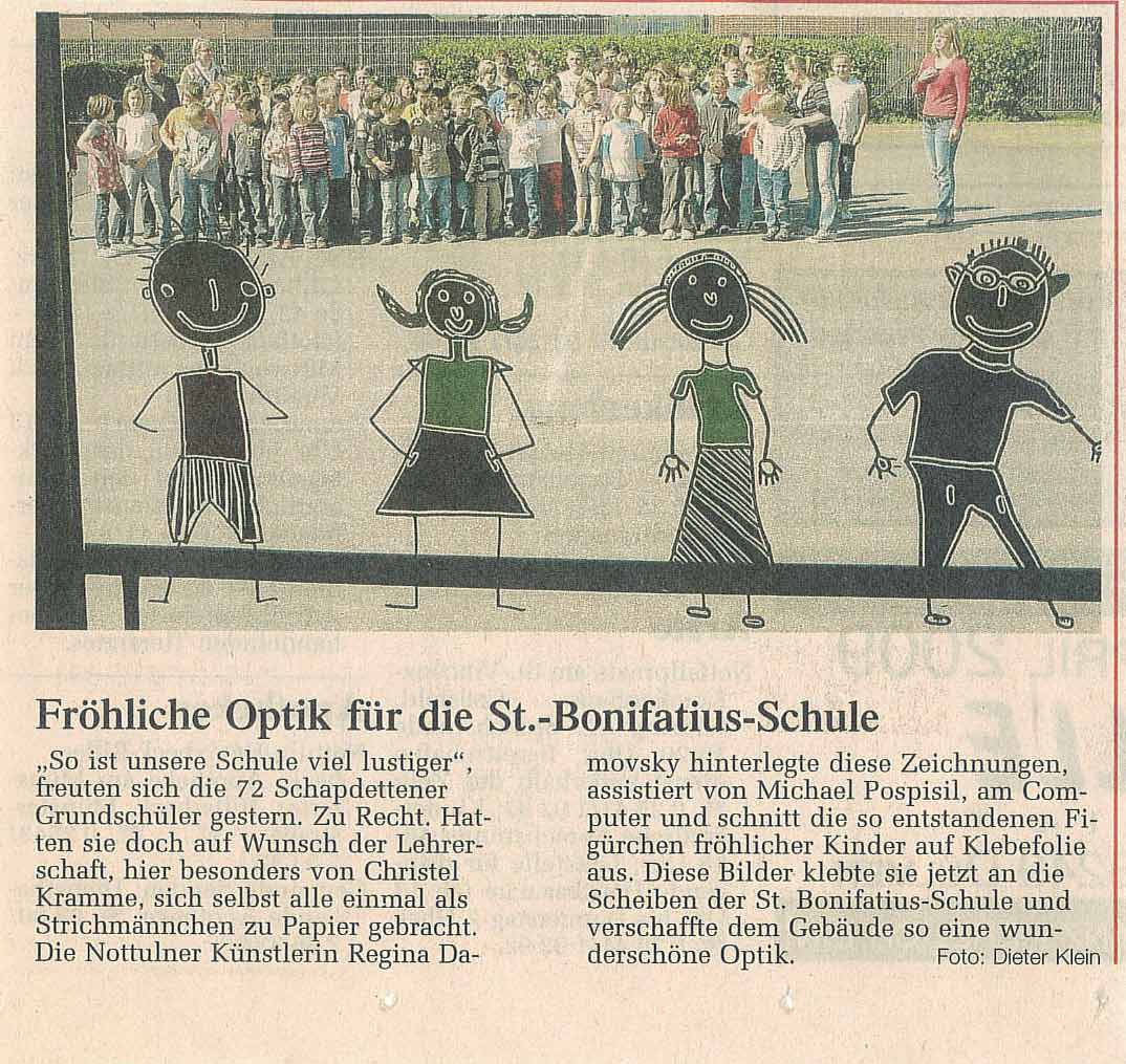 Ein Strichmännchen zeichnen kann jeder. Dies war der Ausgangsgedanke für ein weiteres Kunstprojekt mit Grundschülern. Ziel war es, die Glasfront am Eingang der Schule nicht nur zu verschönern, sondern möglichst alle Schüler daran zu beteiligen. Zeichne dich selbst mit dicken Filzstiften, war der Auftrag, den die Schüler mit großer Begeisterung umsetzten. Mit der technischen Unterstützung eines Mediengestalters wurden dann aus den Kinderzeichnungen Fensterbilder adaptiert, diese wurden auf Klebefolie geplottet und anschließend auf den Fensterscheiben fixiert.