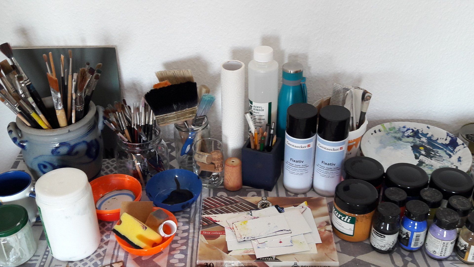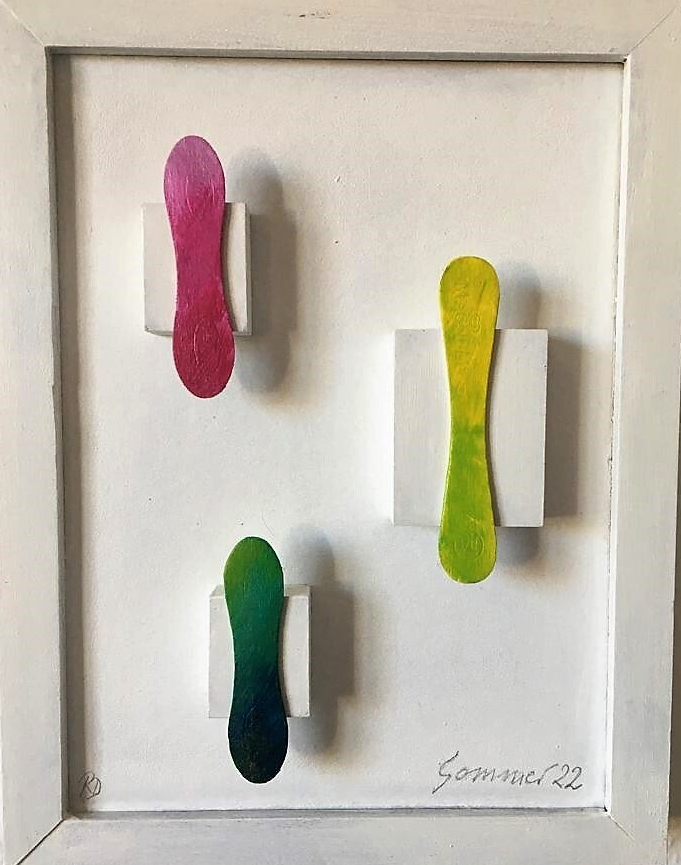 Innerhalb von drei produktiven Wochen entstanden dabei 26 Acrylbilder von Minitatur- bis Großfomat mit einer vielfältigen Formensprache. Unter dem Eindruck des heißen und dürren Sommers, der draußen die Landschaft in eine Steppe verwandelte, entstanden Bilder, die in ihrer Farbigkeit das Gefühl dieser Sommertage zum Ausdruck bringen.